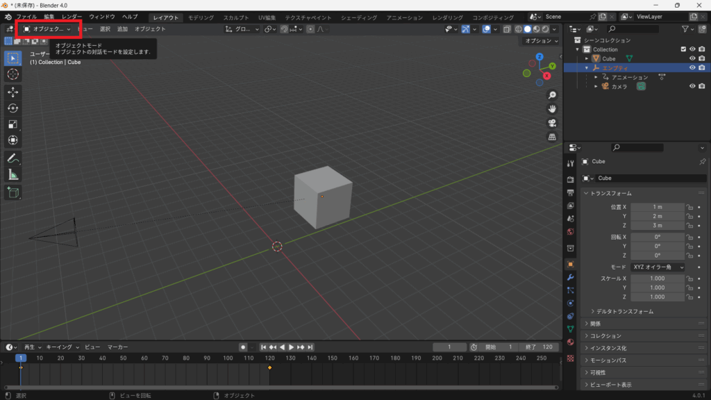 左上のモードを確認し、「オブジェクトモード」に切り替えてから操作。