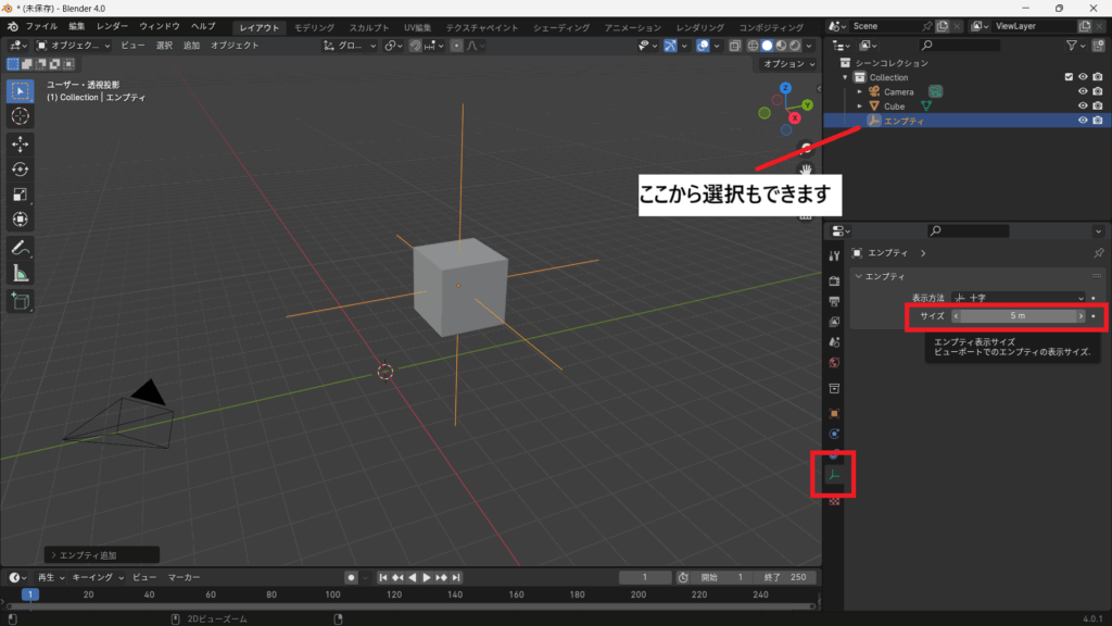エンプティは実体を持たないため、見た目の「十字マーク」が小さいと選択しづらい場合があります。