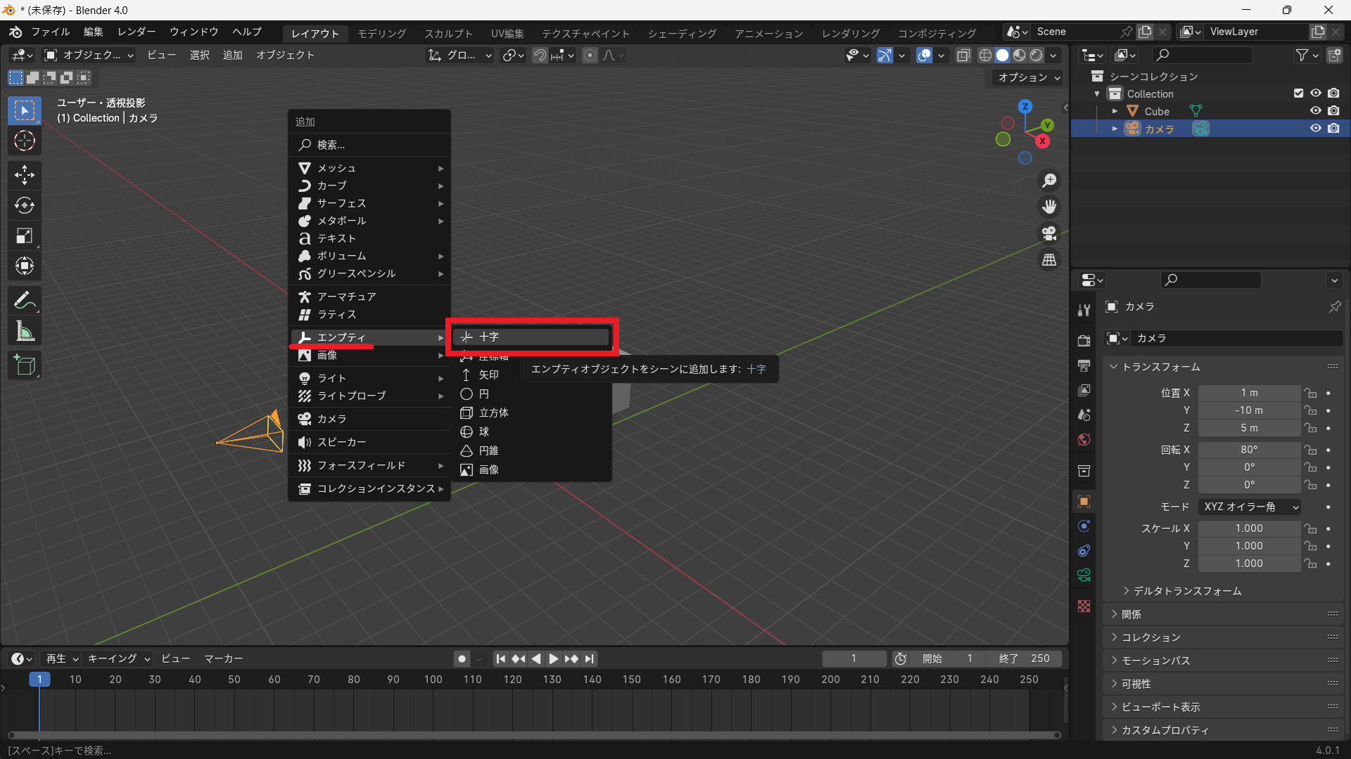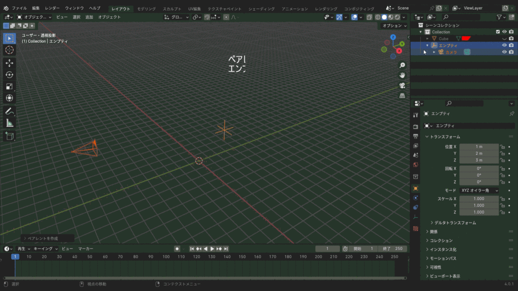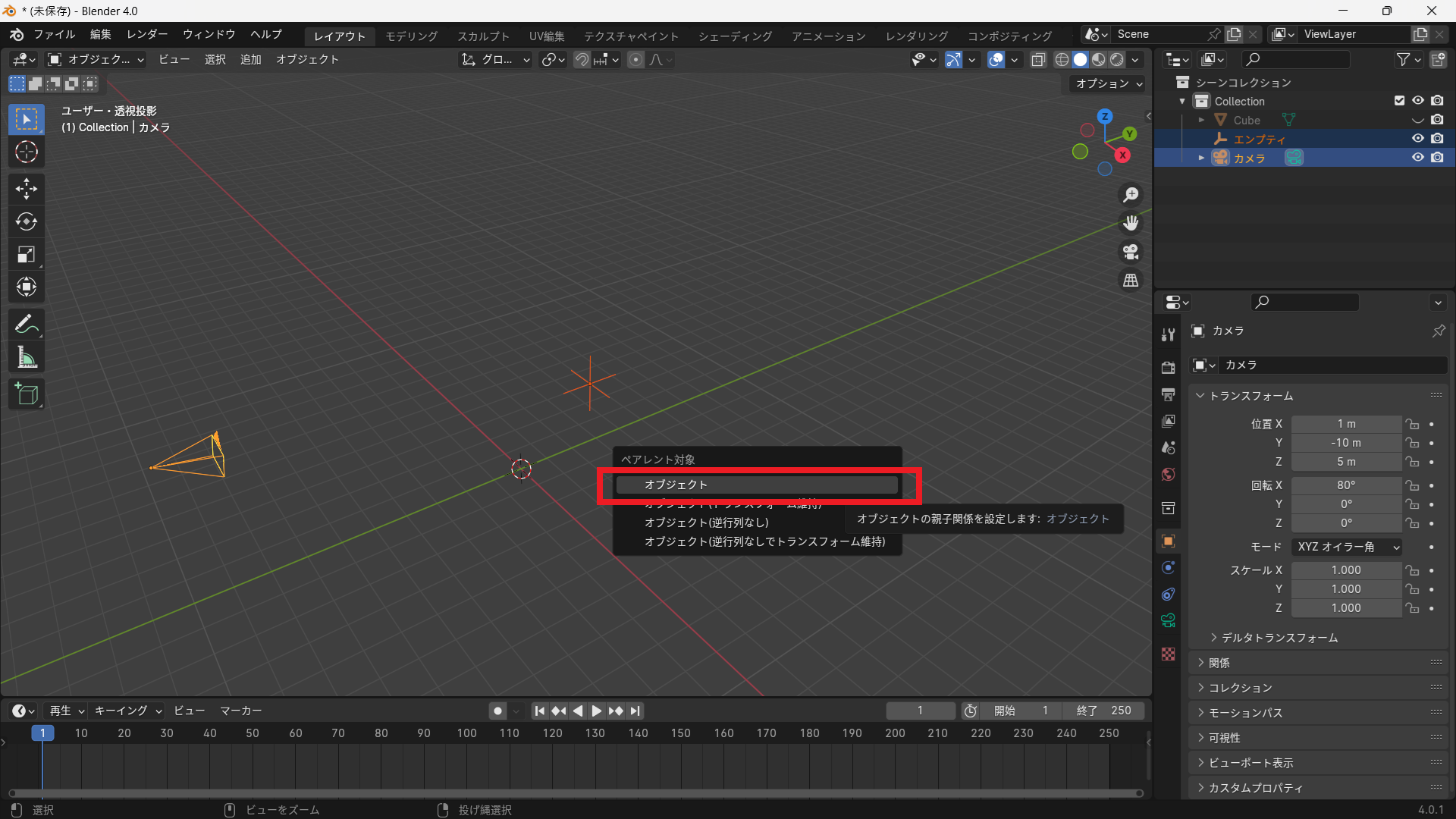これでカメラはエンプティの「子」となり、エンプティを動かすとカメラも一緒に動くようになります。