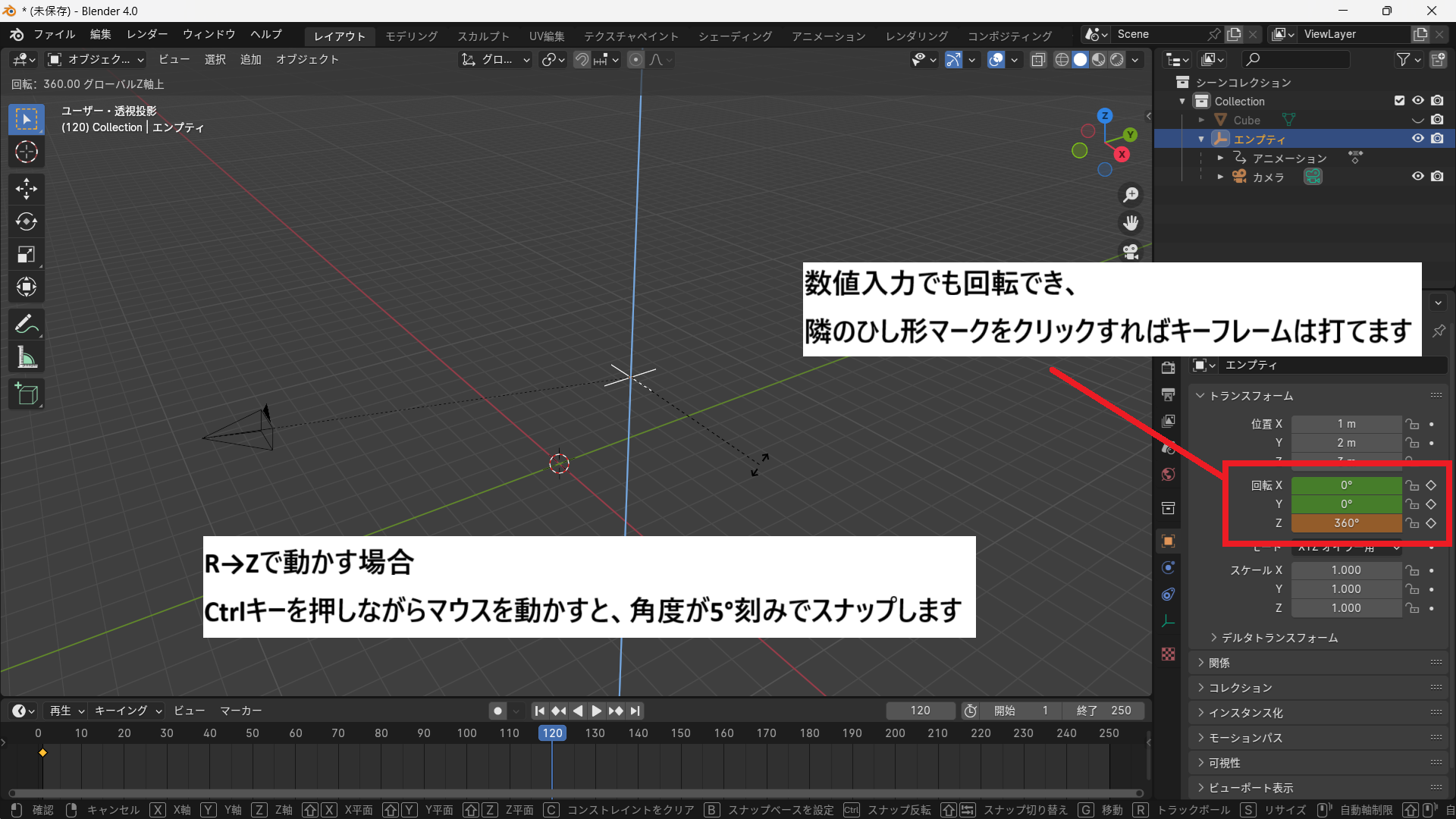 - Z軸を360°回転させ(R → Z → 360)、再びI → 回転でキーフレームを挿入。