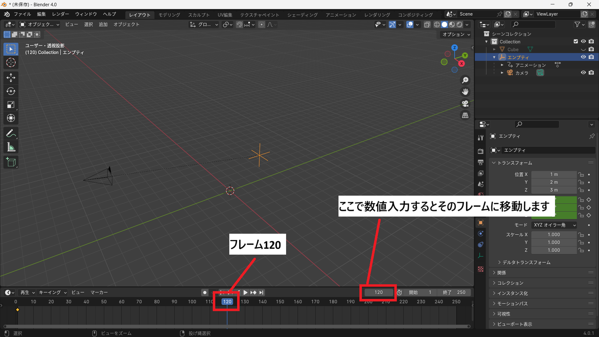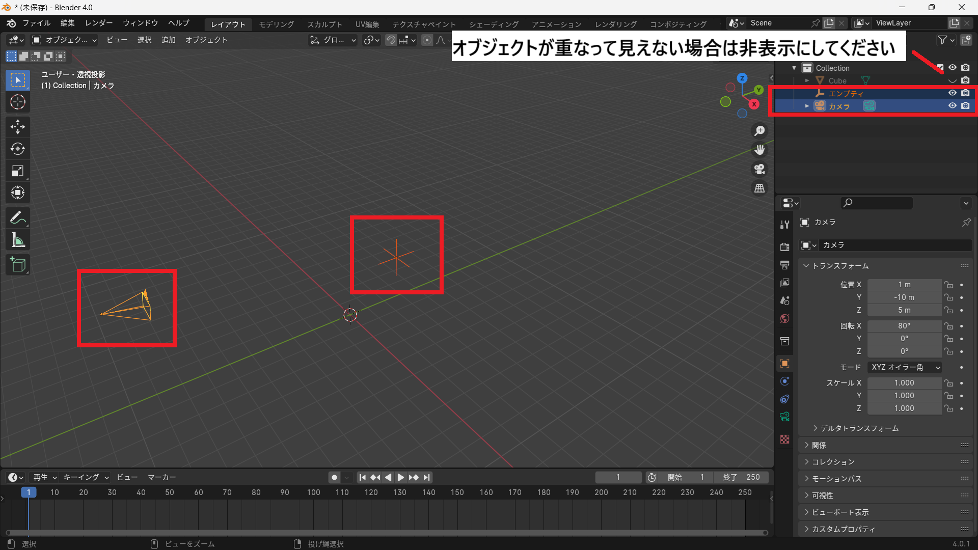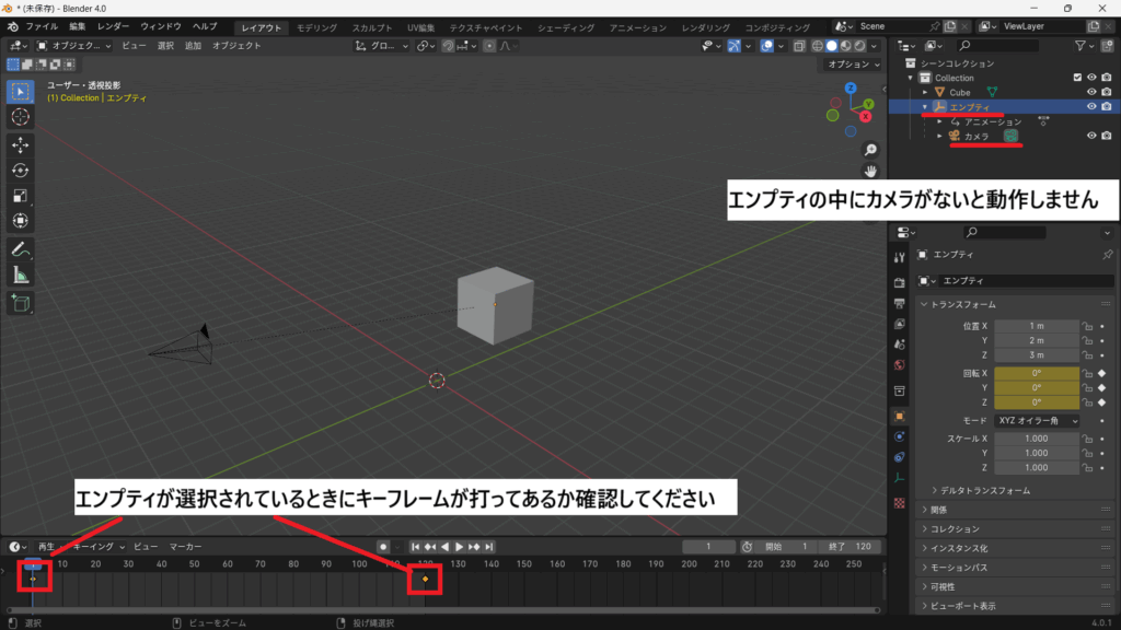 (カメラを先に選択してからエンプティを選択) - タイムラインでキーフレームがどのオブジェクトについているかを確認しましょう。