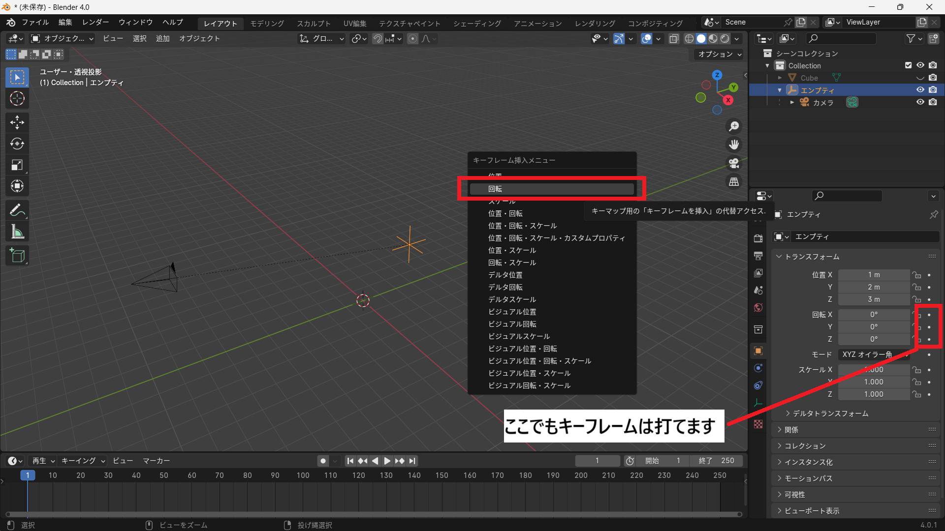 - Iキー → 回転(Rotation) でキーフレームを挿入。