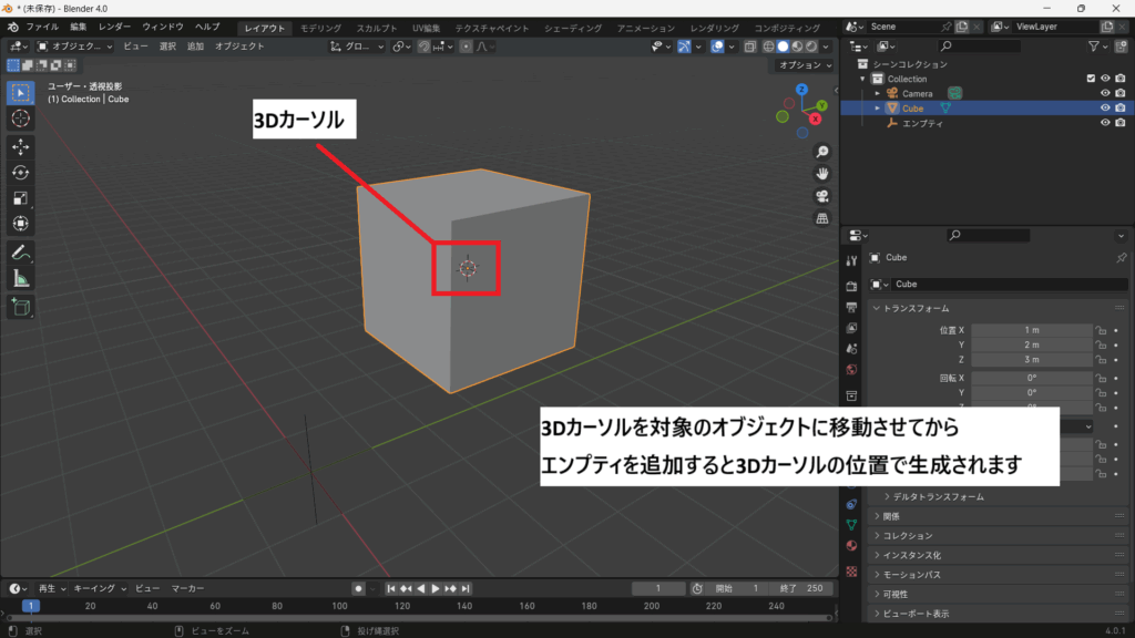 エンプティを追加する前に3Dカーソルを正しくスナップしていない場合。