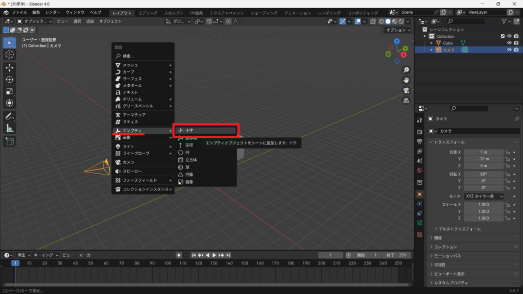 - Shift + A → エンプティ → 十字 (Plain Axes)を追加。