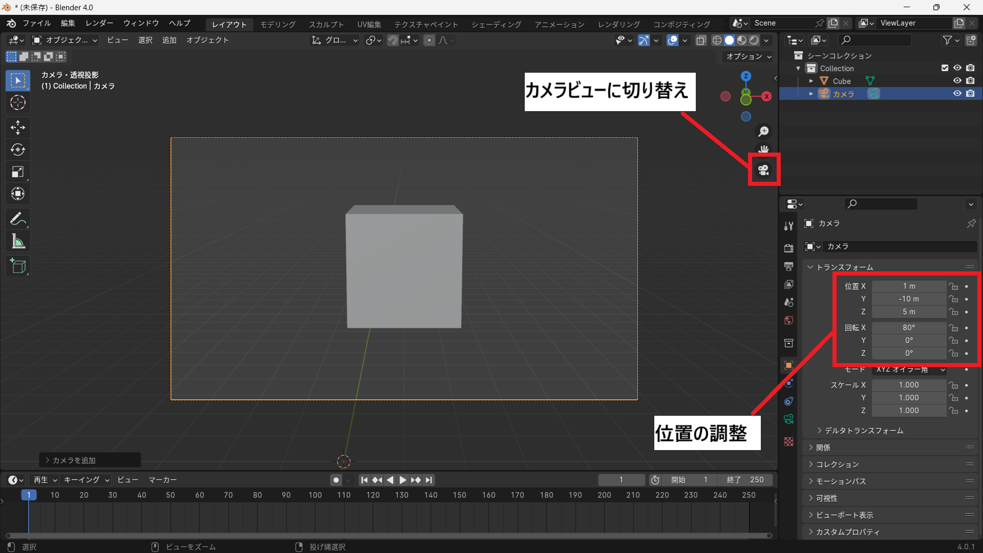 - カメラを追加(Shift + A → カメラ)し、少し離れた位置に移動させます。