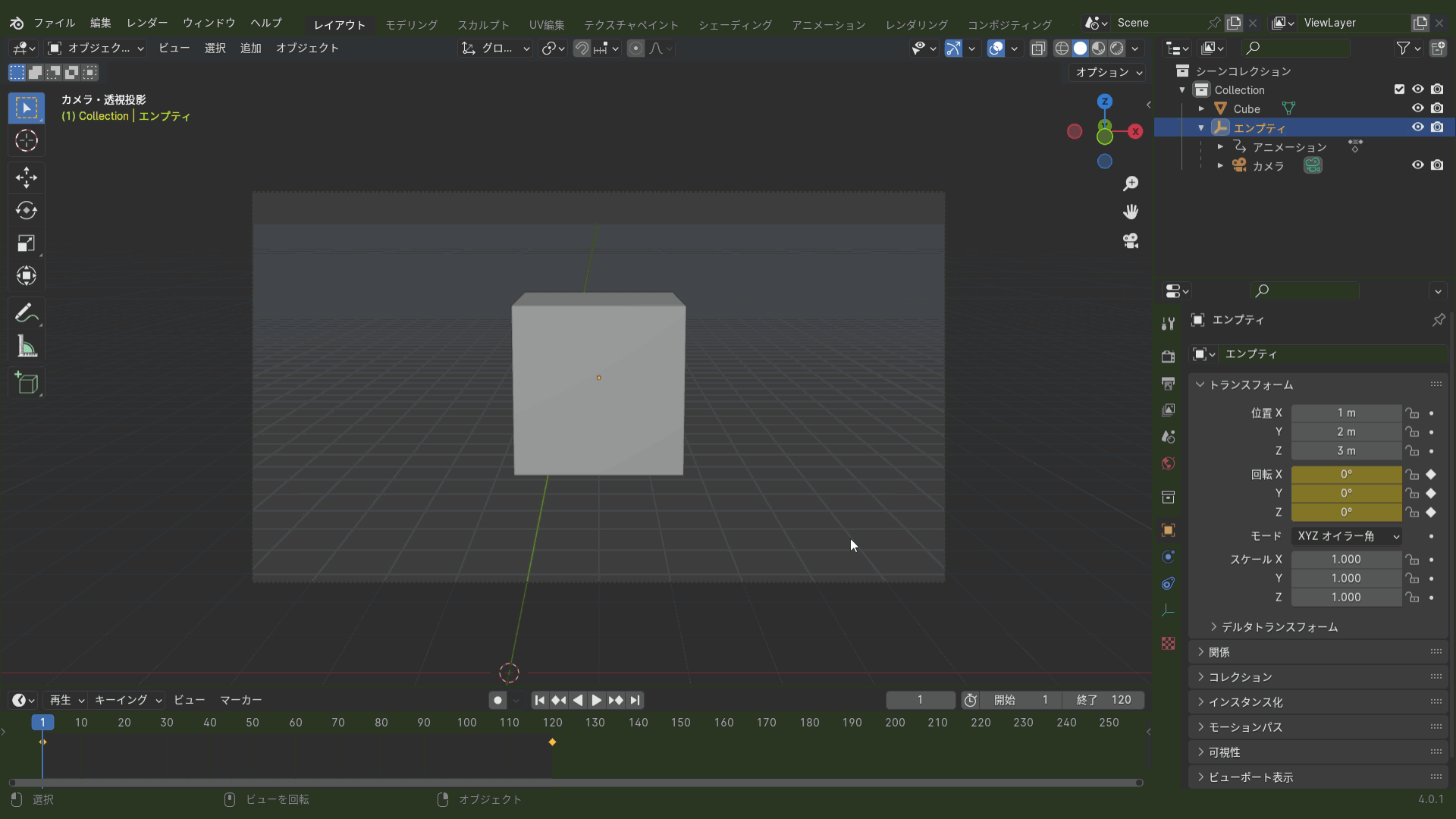 これでカメラはエンプティの「子」となり、エンプティを動かすとカメラも一緒に動くようになります。