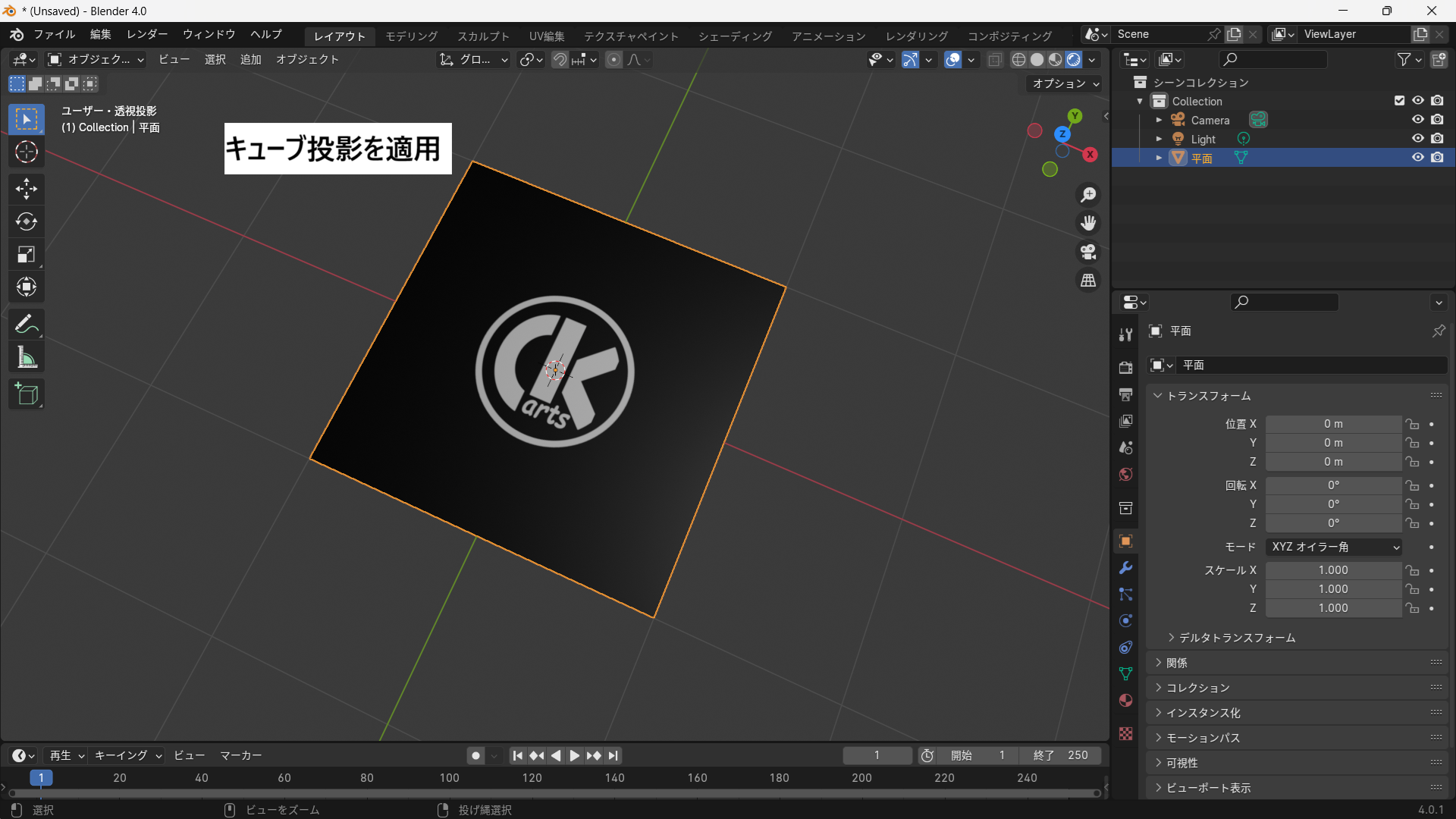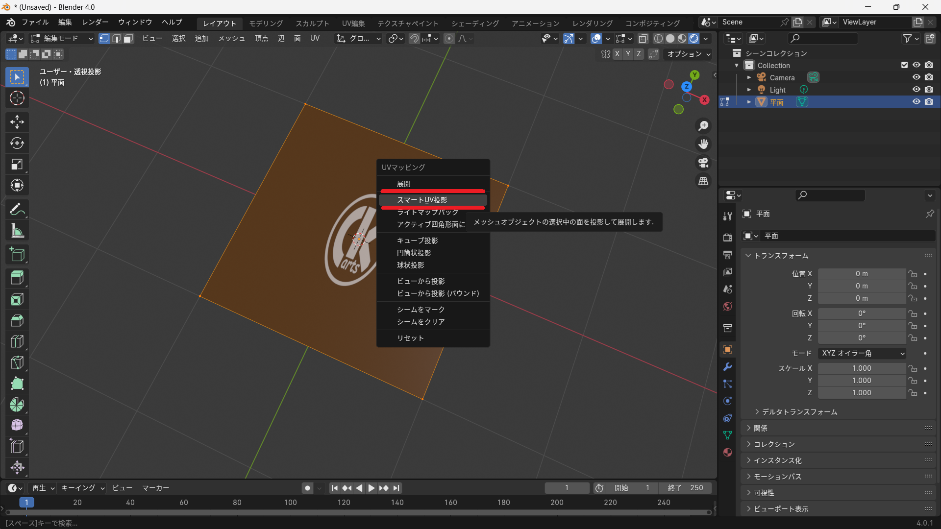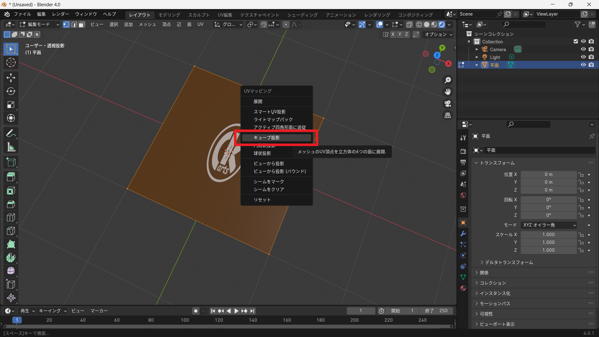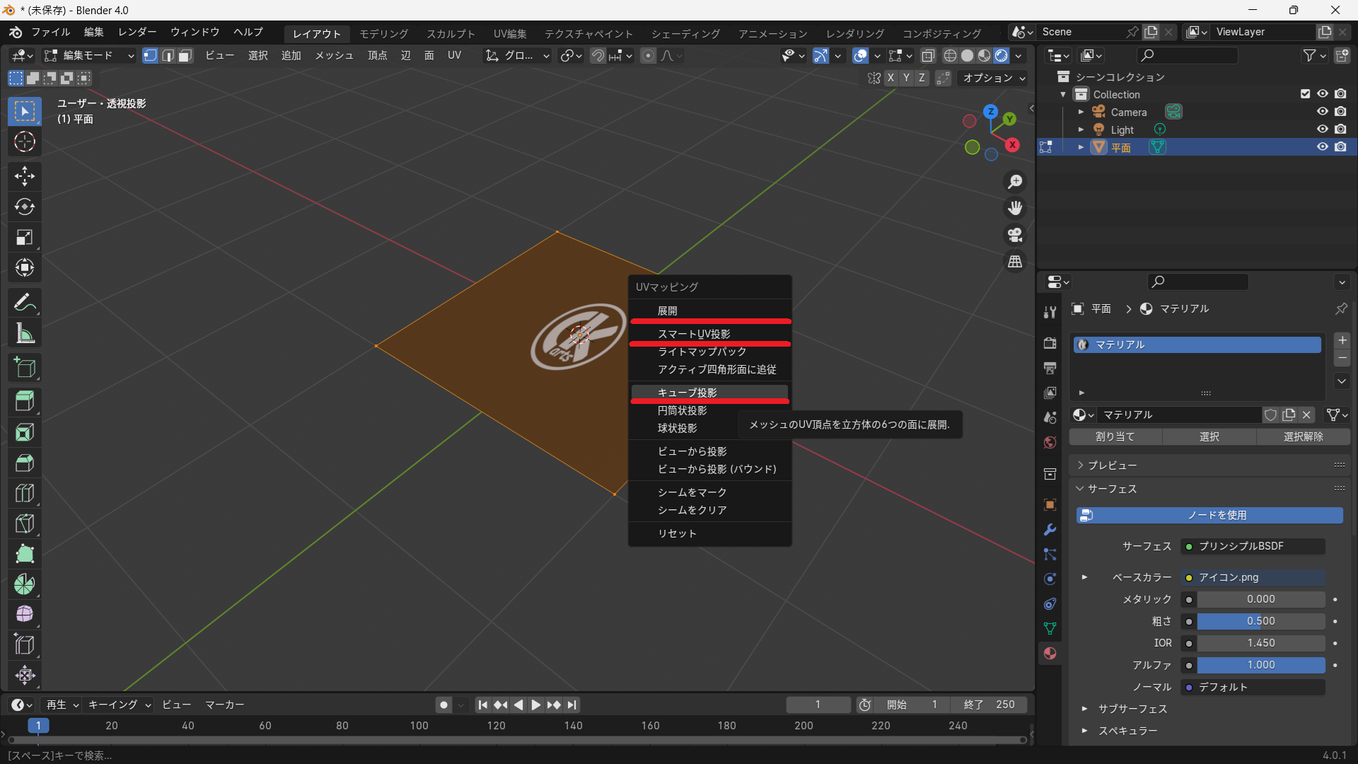 画像が途中で引き伸ばされたり、変な向きに貼り付く場合は必ず UV展開 が必要です。
