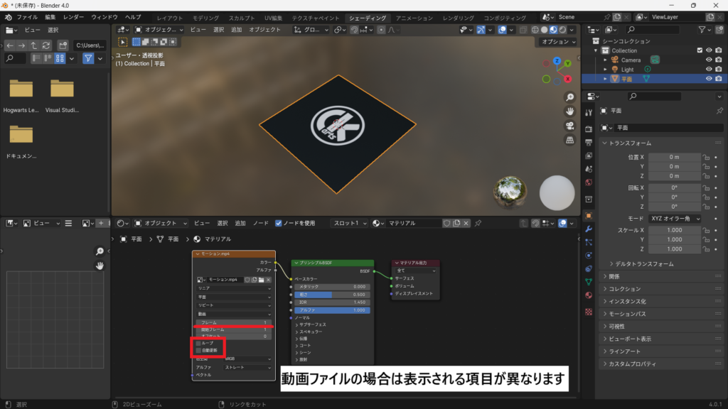 画像と同じく 画像テクスチャノードを追加し、「開く」から動画ファイル(mp4 / mov など)を読み込みます。