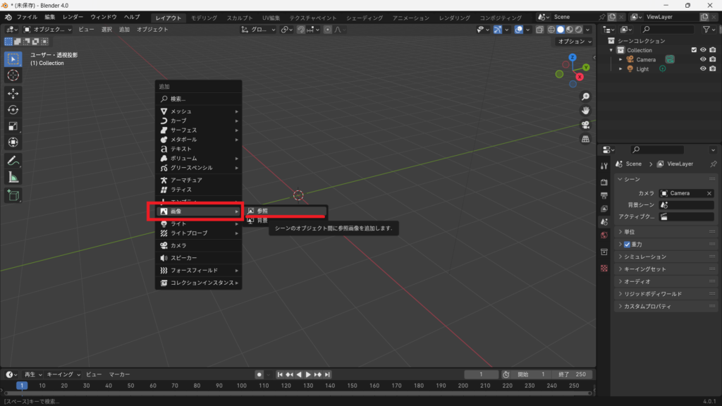 Blenderでは、Shift + A メニューから画像や動画を選択するだけで、テクスチャ付きの平面を自動生成できる機能があります。