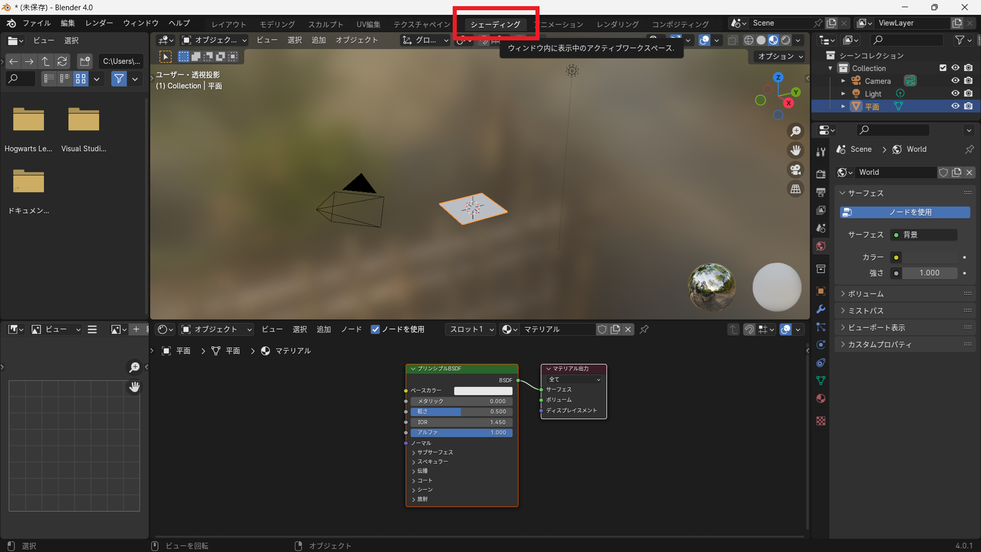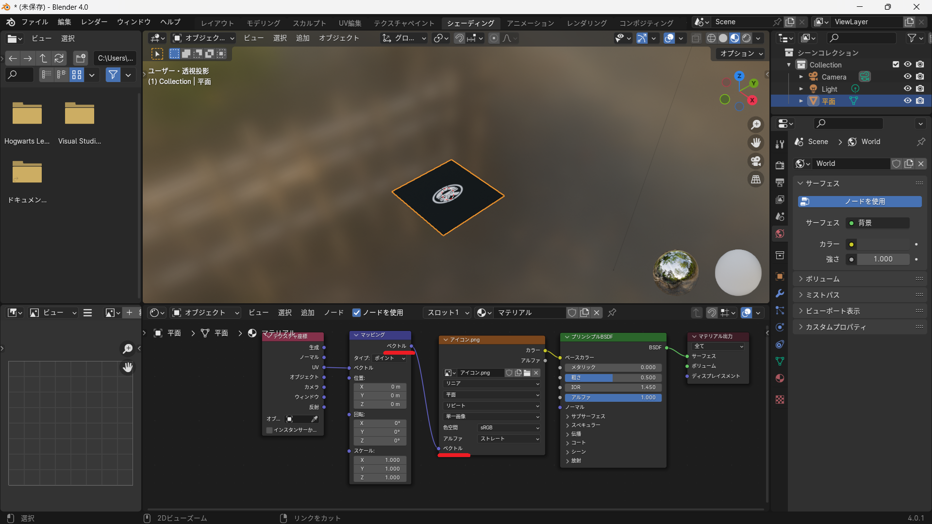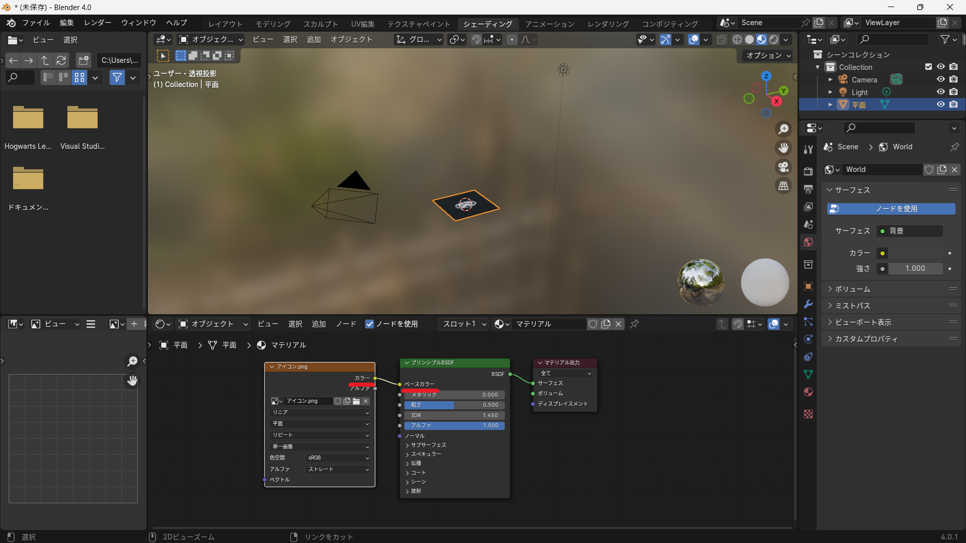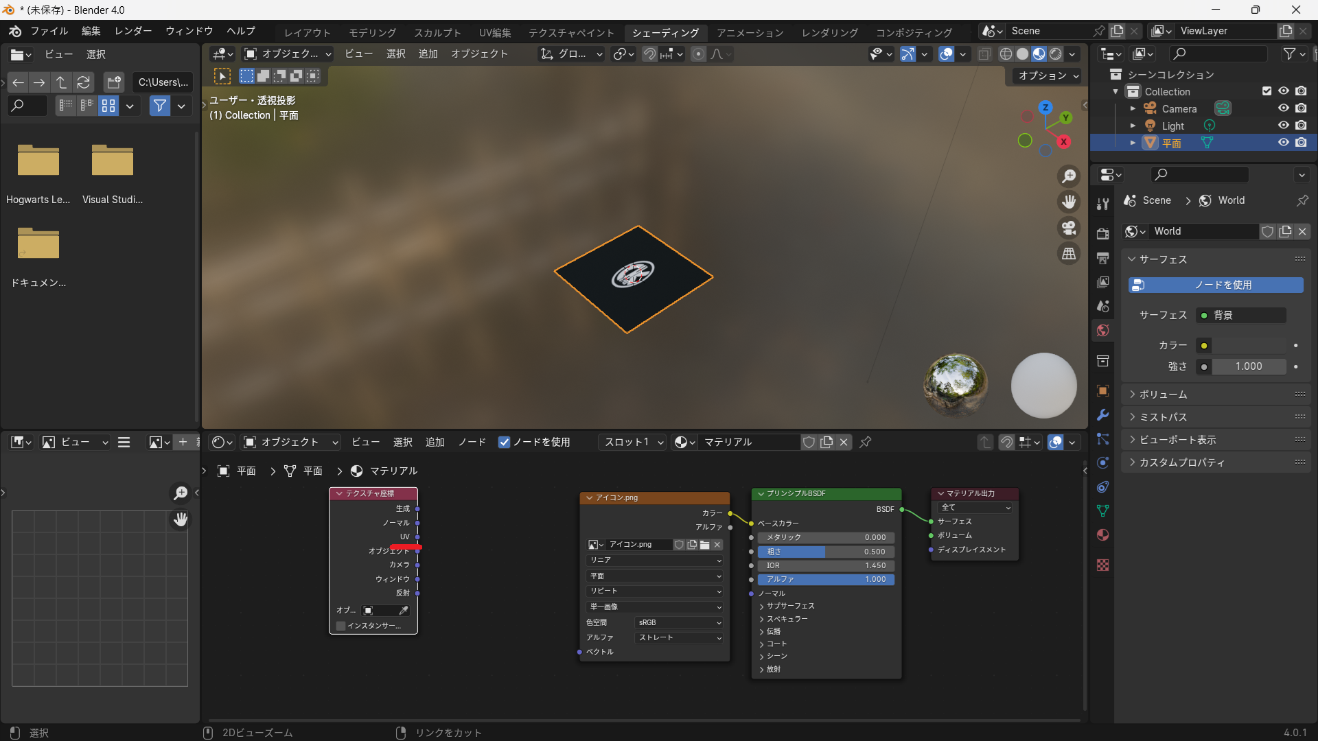 今回は「シェーダーエディター」を使うやり方を説明しますが、これがBlenderの基本的な画像貼り付け手順になります。