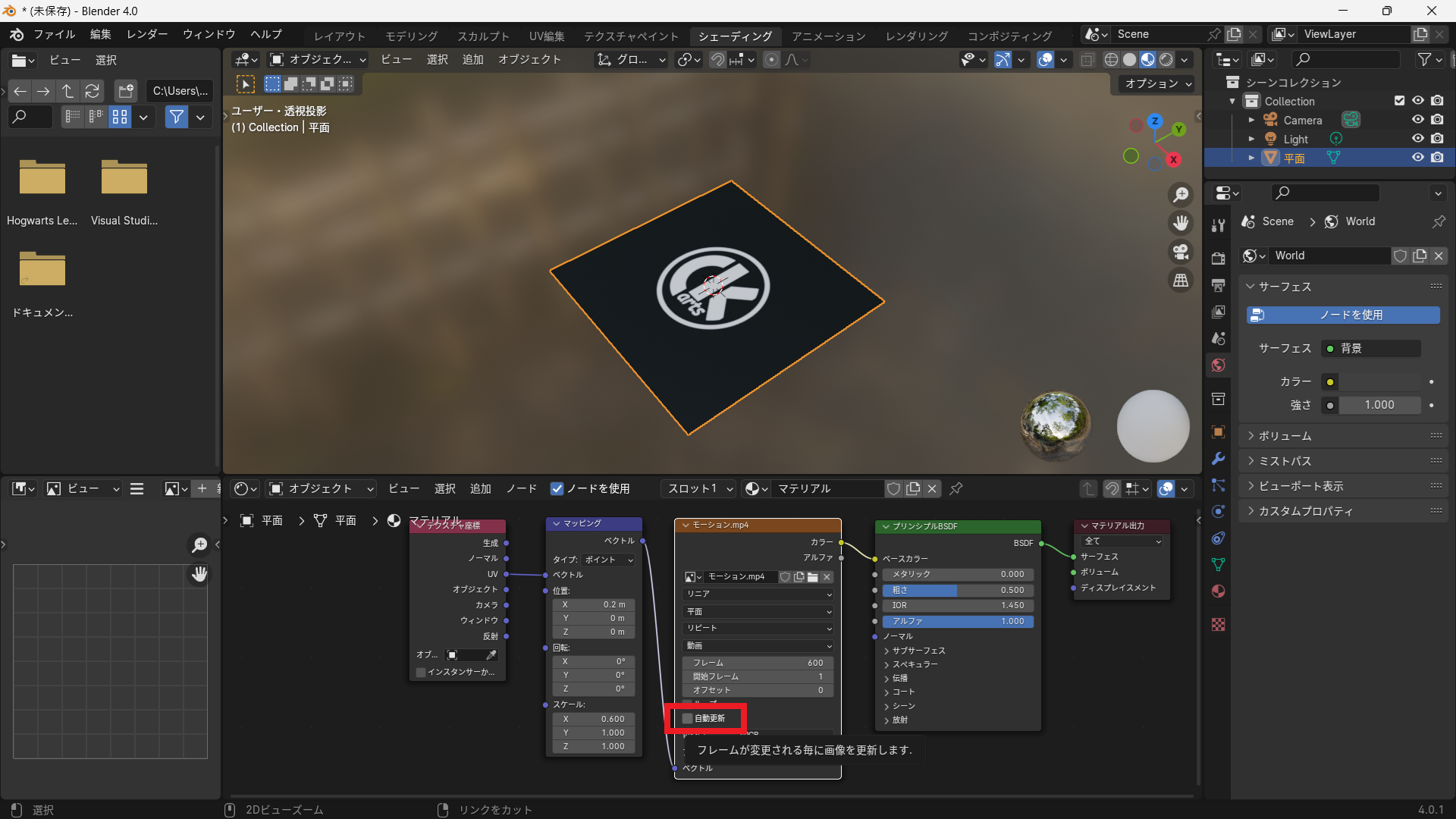 ※Frames は理論上「動画の長さ × Blender のFPS」で計算できますが、動画の形式や元動画のFPSによっては途中で止まることがあります。その場合は 計算値にこだわらず、実際に最後まで再生される値に調整してください。特に mp4 動画では、計算値より大きな Frames が必要になることがあります。 - 自動更新:チェックを入れる
