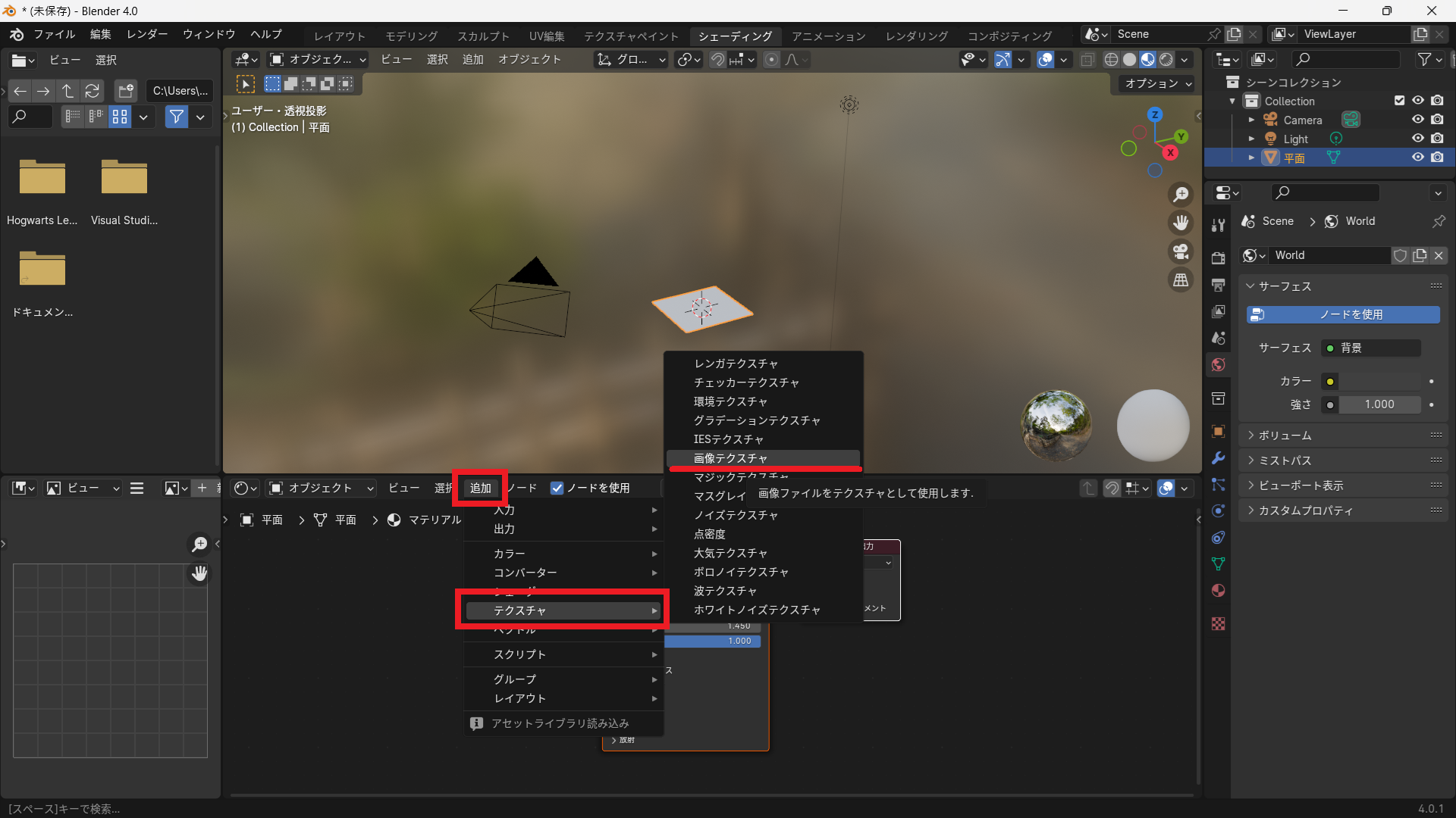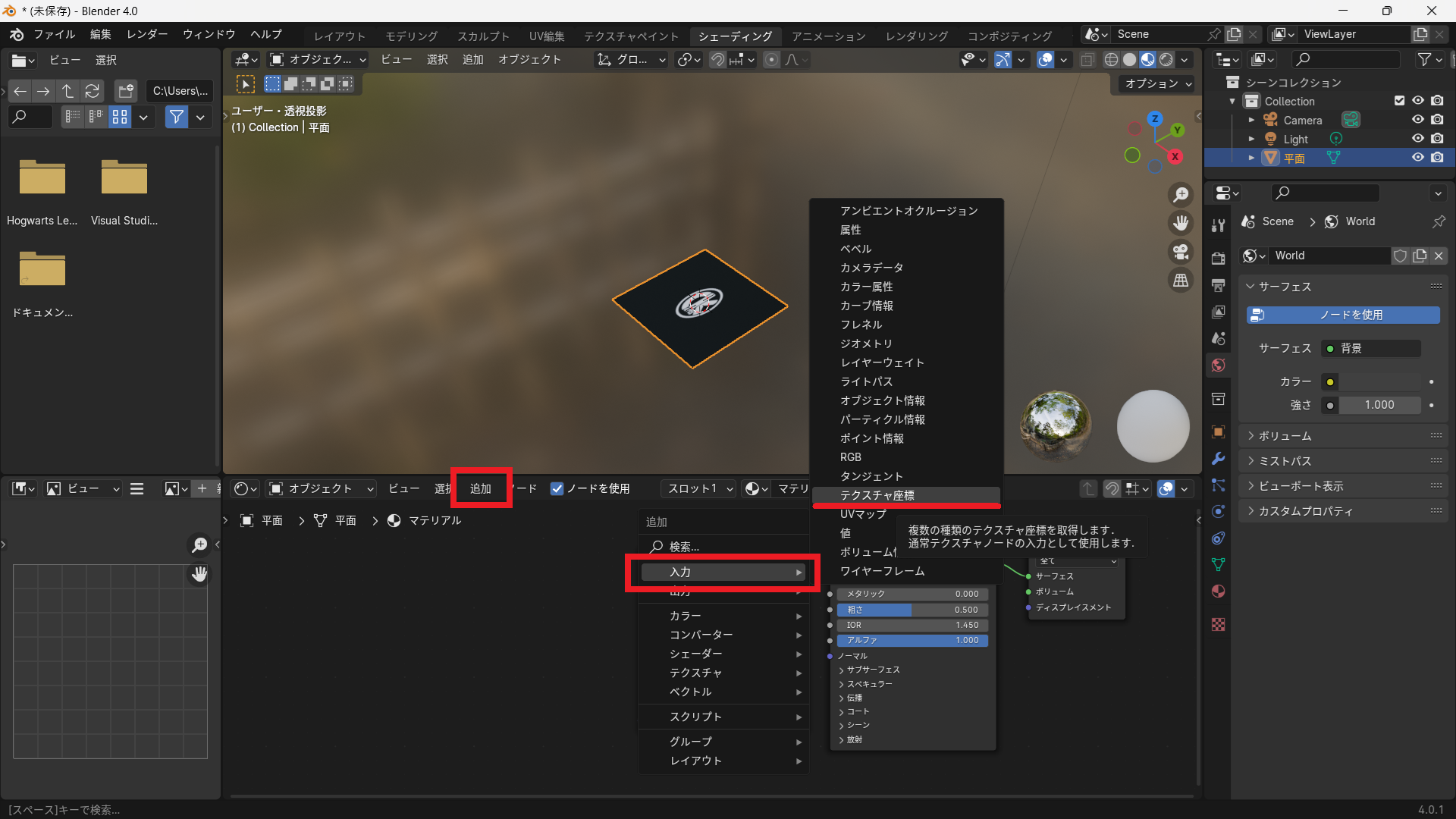 - Shift + A → テクスチャ → 画像テクスチャ を追加