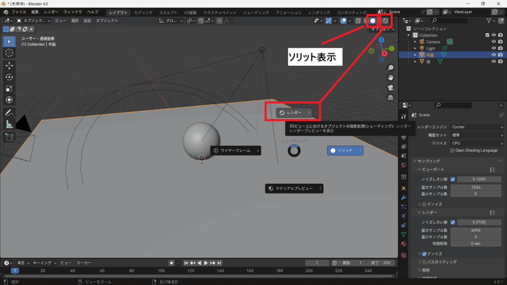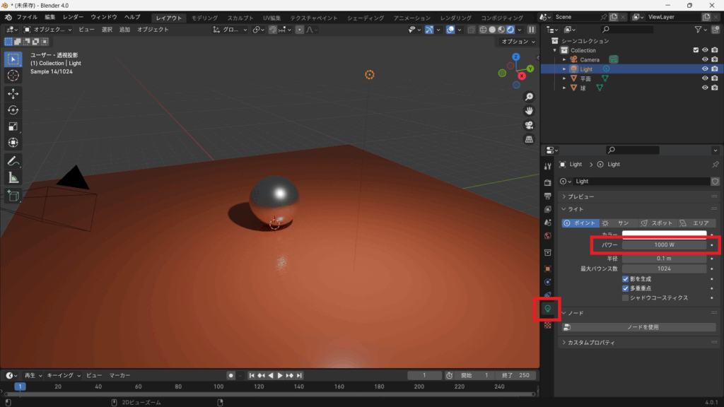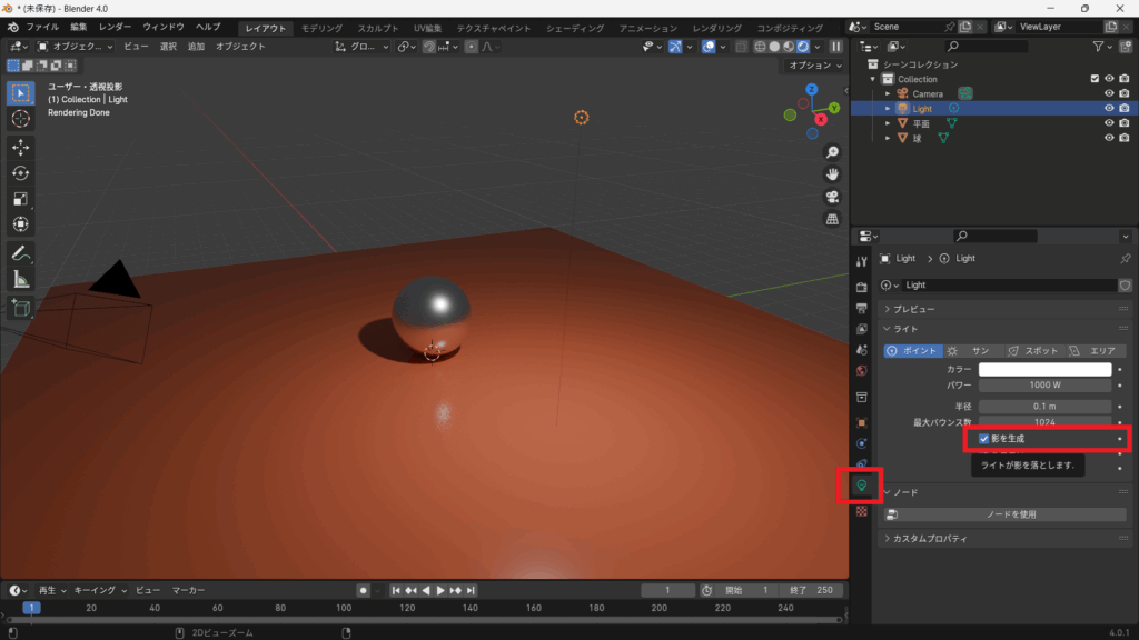 ライトを追加しても「ソリッド表示」では効果が見えません。必ず 「レンダープレビュー(Zキー → レンダー)」 に切り替えて確認すると良いです
