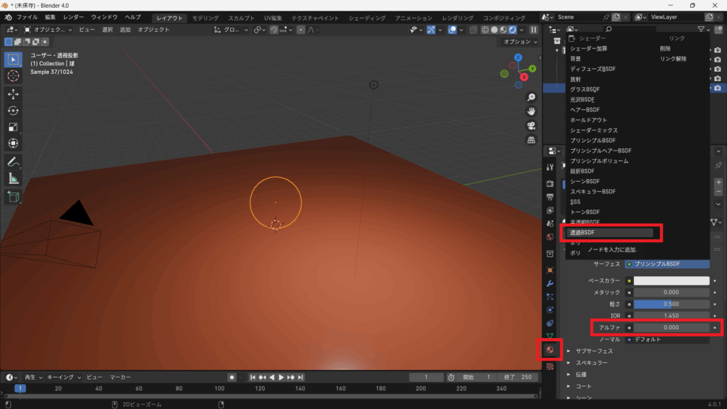 もし透過オブジェクトに影を落としたい場合は、透明度を下げずに半透明のマテリアル(透明感はあるがアルファを0にしない)を設定するか、別の影用オブジェクトを用意して擬似的に再現する方法を使います。
