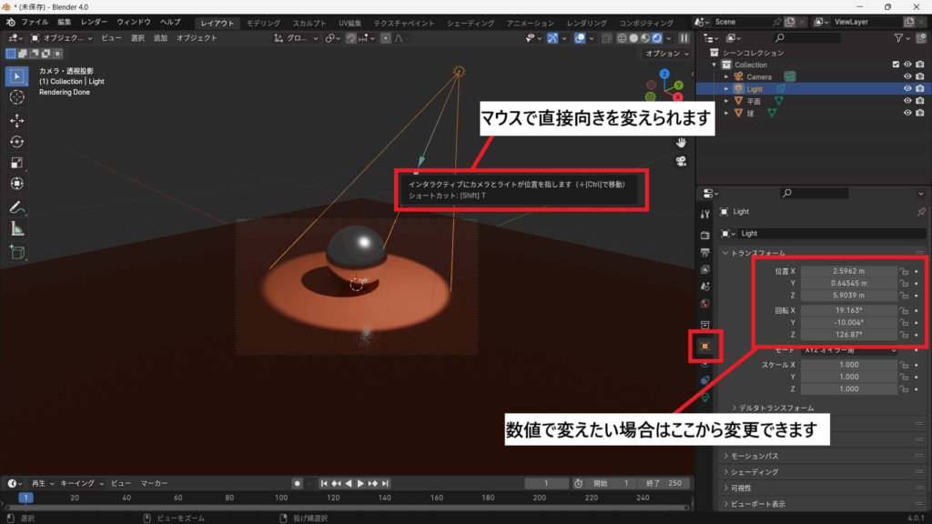 ライトを選択し、「G」や「R」で動かしたり回転させながら、「レンダービュー」でリアルタイムに確認します。