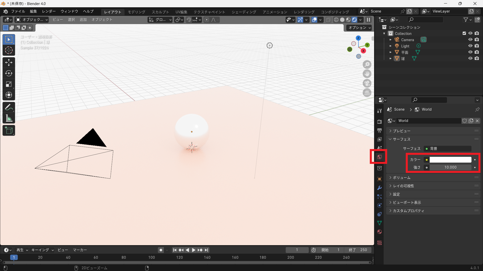 また、World設定(環境光) の「カラー」や「強さ」が高すぎる場合もあるので確認しましょう。