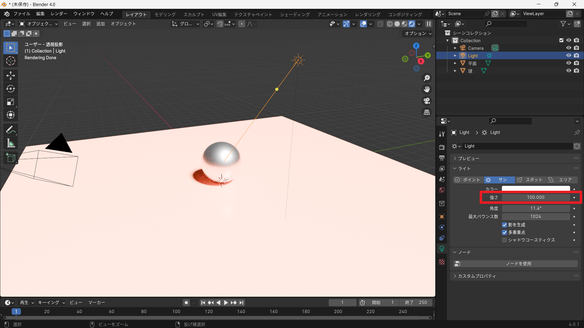 ライトを選択し、右側の「ライトプロパティ(電球アイコン)」で「強さ」を上げます。