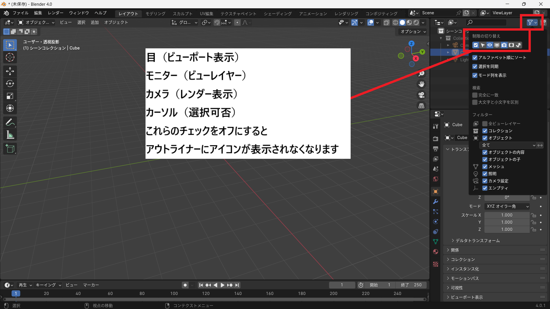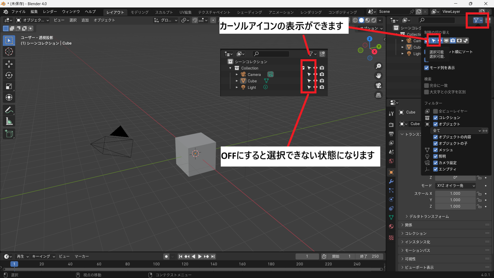より細かいコントロールをしたい場合は、画面右上にある「アウトライナー」を使います。ここにはシーン内のオブジェクトが一覧表示されており、それぞれの横に「目のアイコン」と「カメラのアイコン」があります。