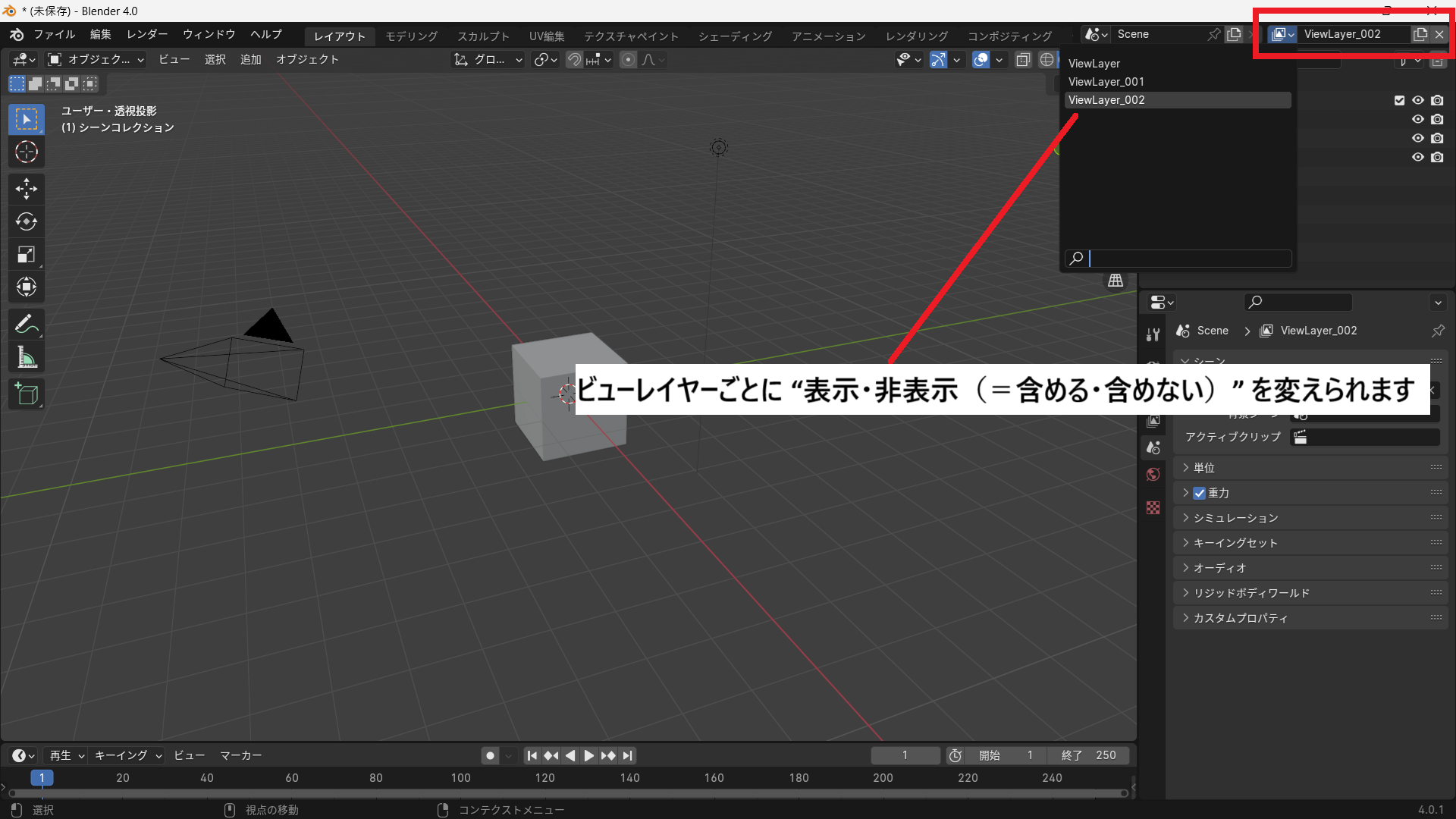 - 別のビューレイヤーを使うことで、シーンを分けてレンダリング可能