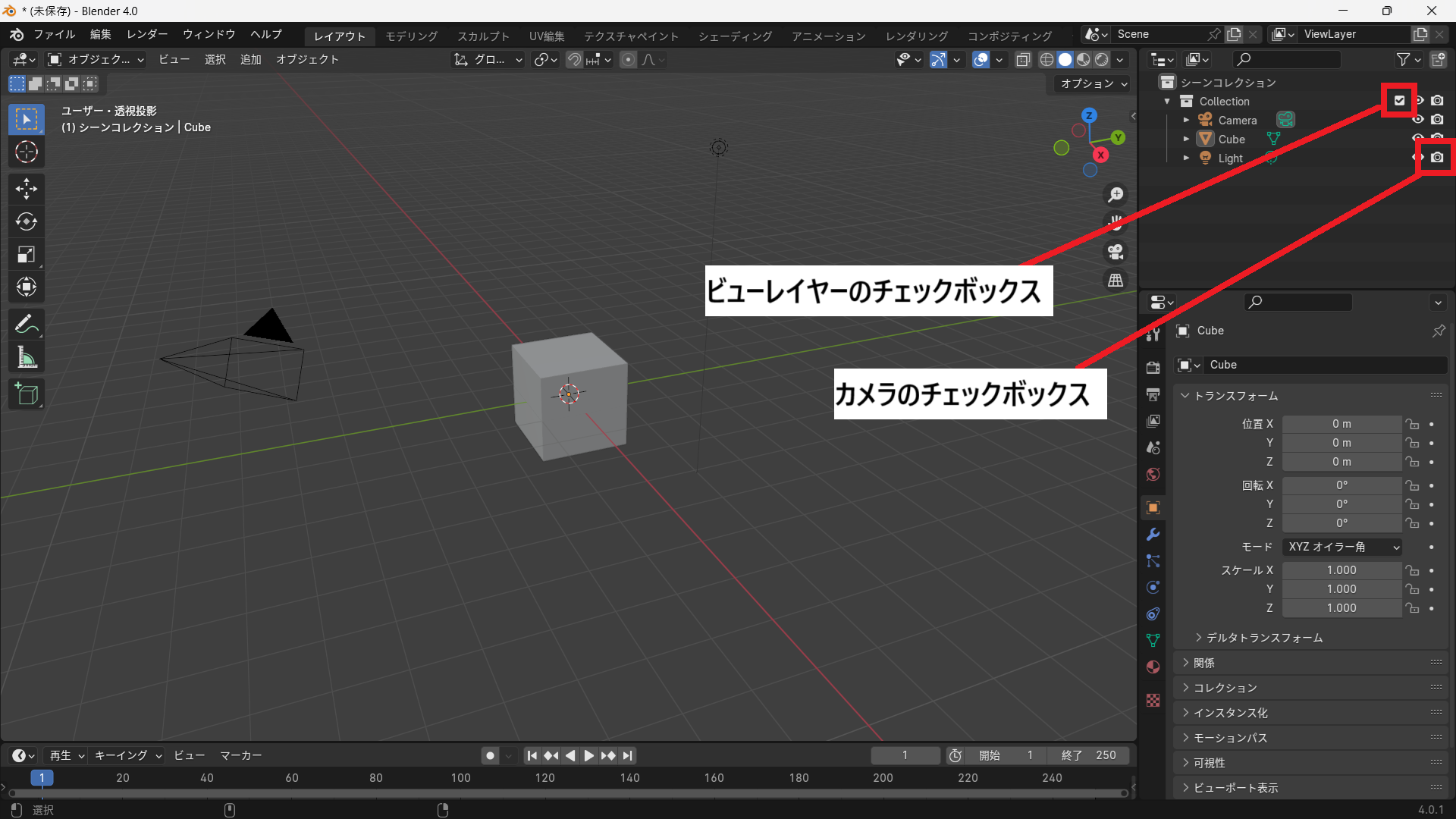 - 別のビューレイヤーを使っている場合、そのレイヤーに含まれているか確認