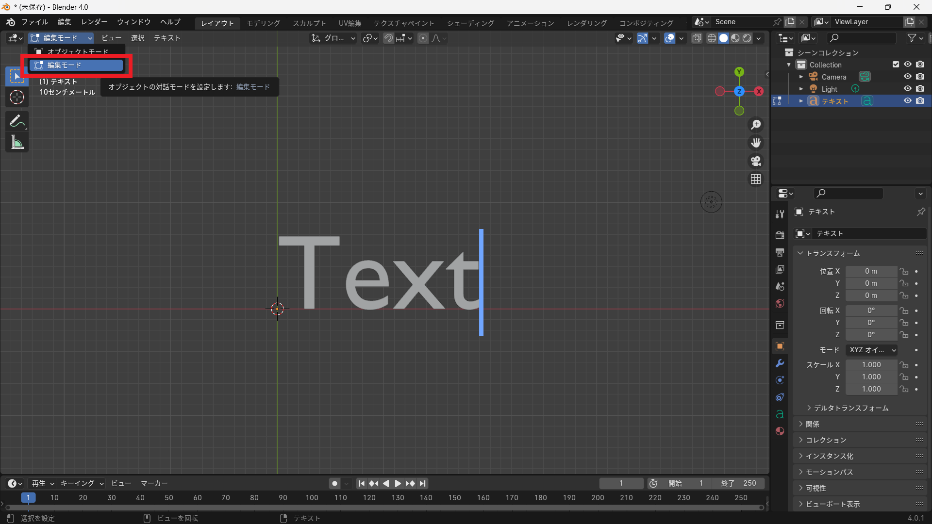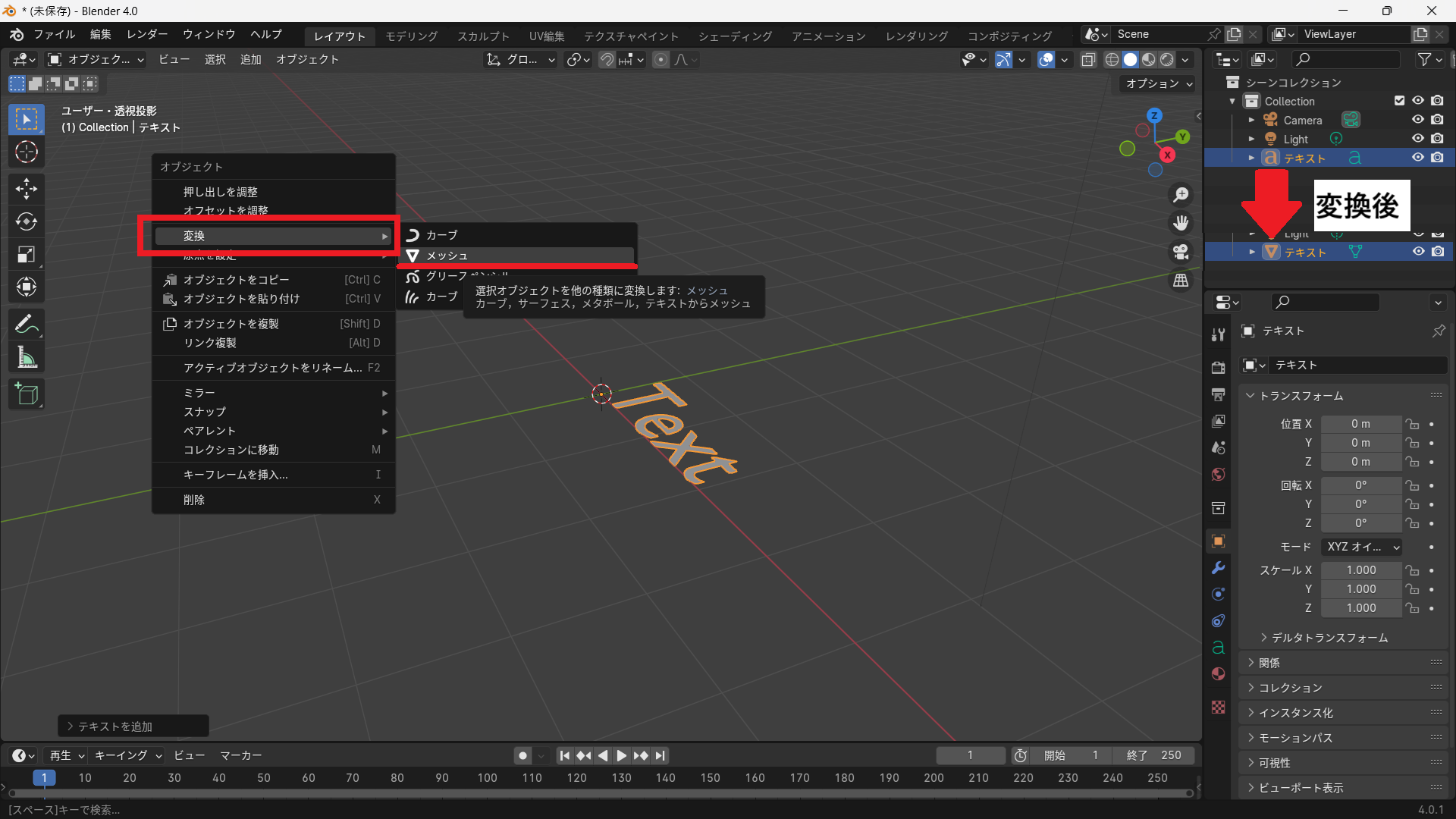 3. オブジェクトモードで文字オブジェクトを選択 → 右クリック → 「変換 → メッシュ」。