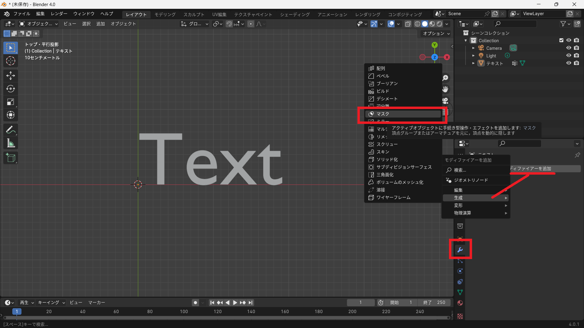 1. 文字オブジェクトを選択 → モディファイアープロパティ → 「マスク」を追加。